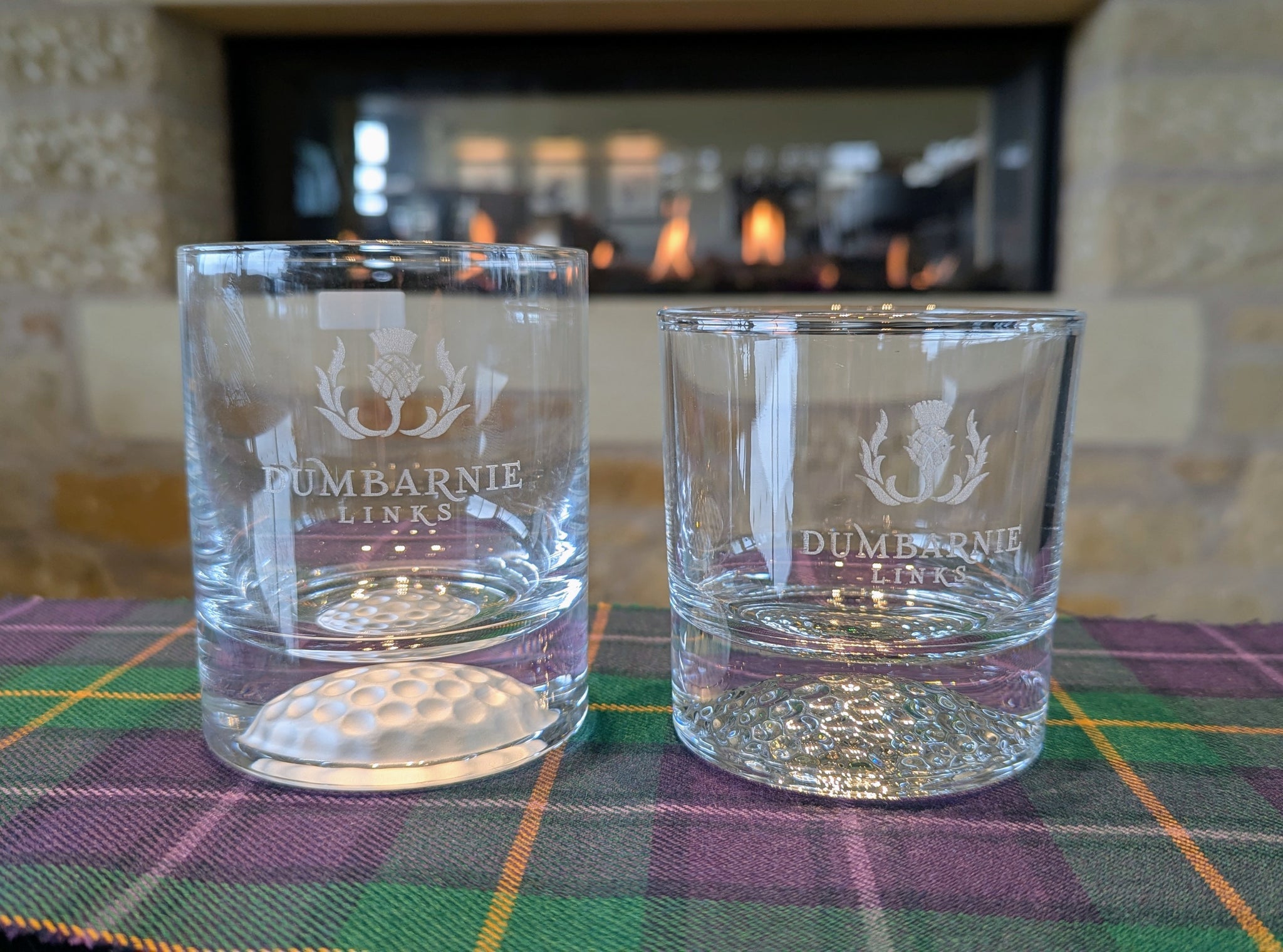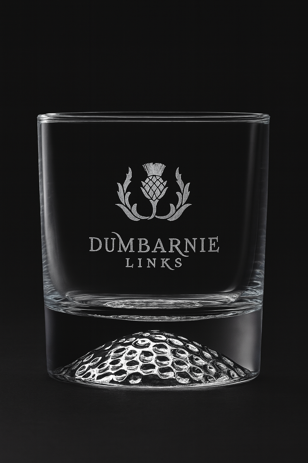 Engraved with the Dumbarnie logo this heavy whisky glass features an engraved golf ball in either the bigger frosted glass or shorter, clear glass version.